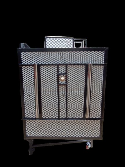 Estructura metálica ángulo y solera, y metal desplegado calibre 14. fibra cerámica., quemador atmosférico QA12, manguera para gas, regulador de alta presión, válvula de paso, manómetro. Incluye 1 placa refractaria cordierita de 52x50cm y 4 postes refractarios 15cm.