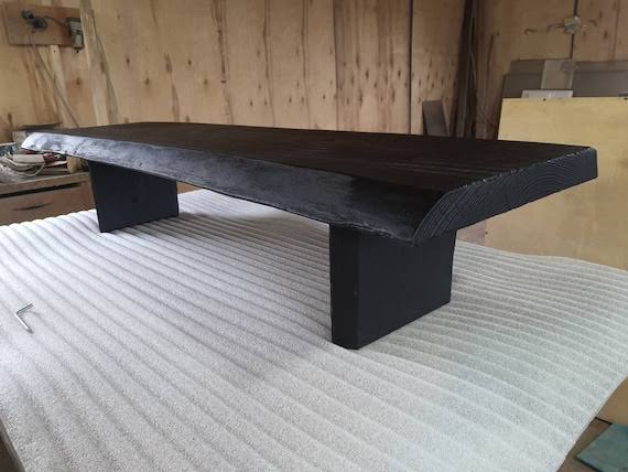 Mesa elaborada con maderas y placas cerámicas, acabado en tonalidades en negro.